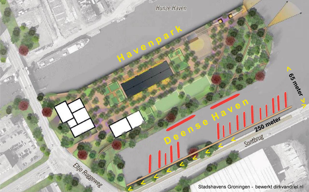 ,,Daar is in de Deense Haven ook alle ruimte voor’’, zegt nautisch adviseur Van Driel. Zijn plan past volgens hem bovendien perfect bij de gemeentelijke plannen met de ‘landtong’ aan de noordzijde van de haven. Op dat schiereiland is nu nog de Ritsema groep (van het havenbedrijf, de zand- en grindhandel en sierbestrating) gevestigd. Het wordt omgetoverd tot Havenpark, als onderdeel van nieuwbouwwijk Stadshavens langs het Eemskanaal.