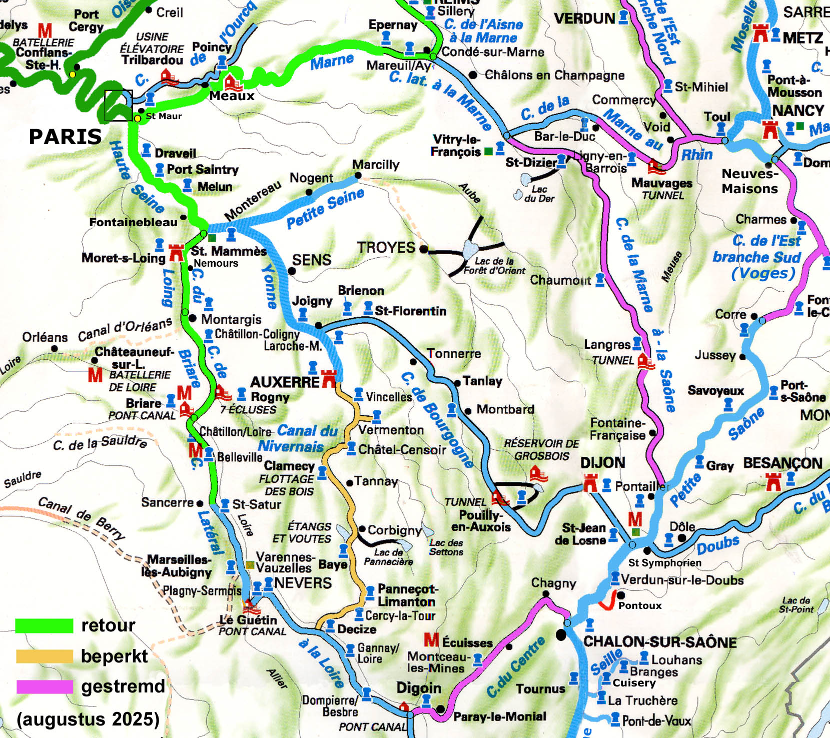 Wij hebben vooral te maken met een stremming tot mogelijk 1 juli van het afsnijdingskanaal van de Marne bij Meaux vanwege reparatie van de stuw. Vandaar een omweg naar Parijs. Grote rivieren als de Oise, de Seine, de Yonne maar ook de Marne geven 's zomers doorgaans weinig problemen.